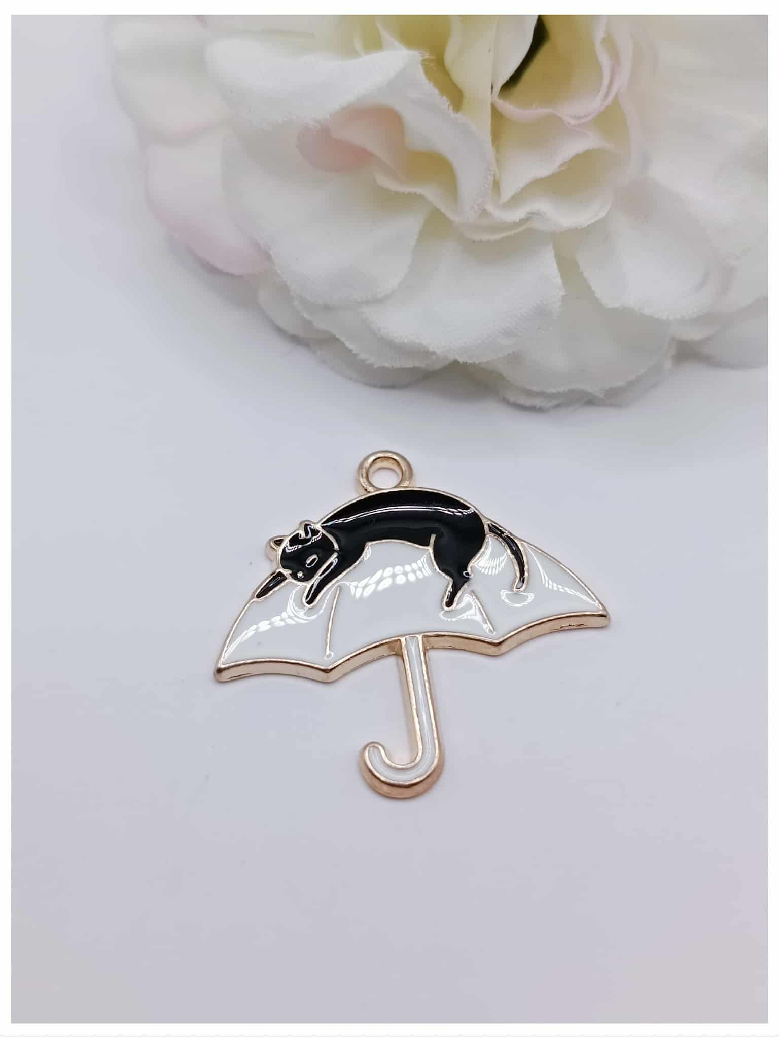 Breloque dorée émaillée chat noire parapluie