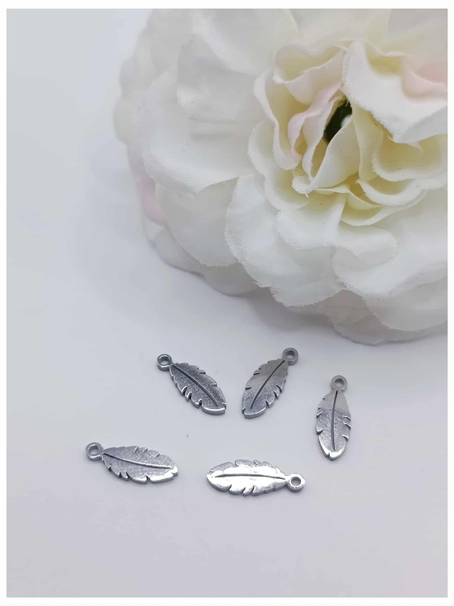 Lot de 5 breloques en acier inoxydable plume de 4 x 11 mm.